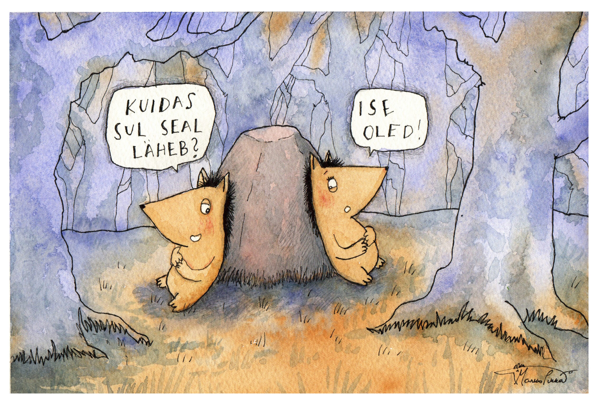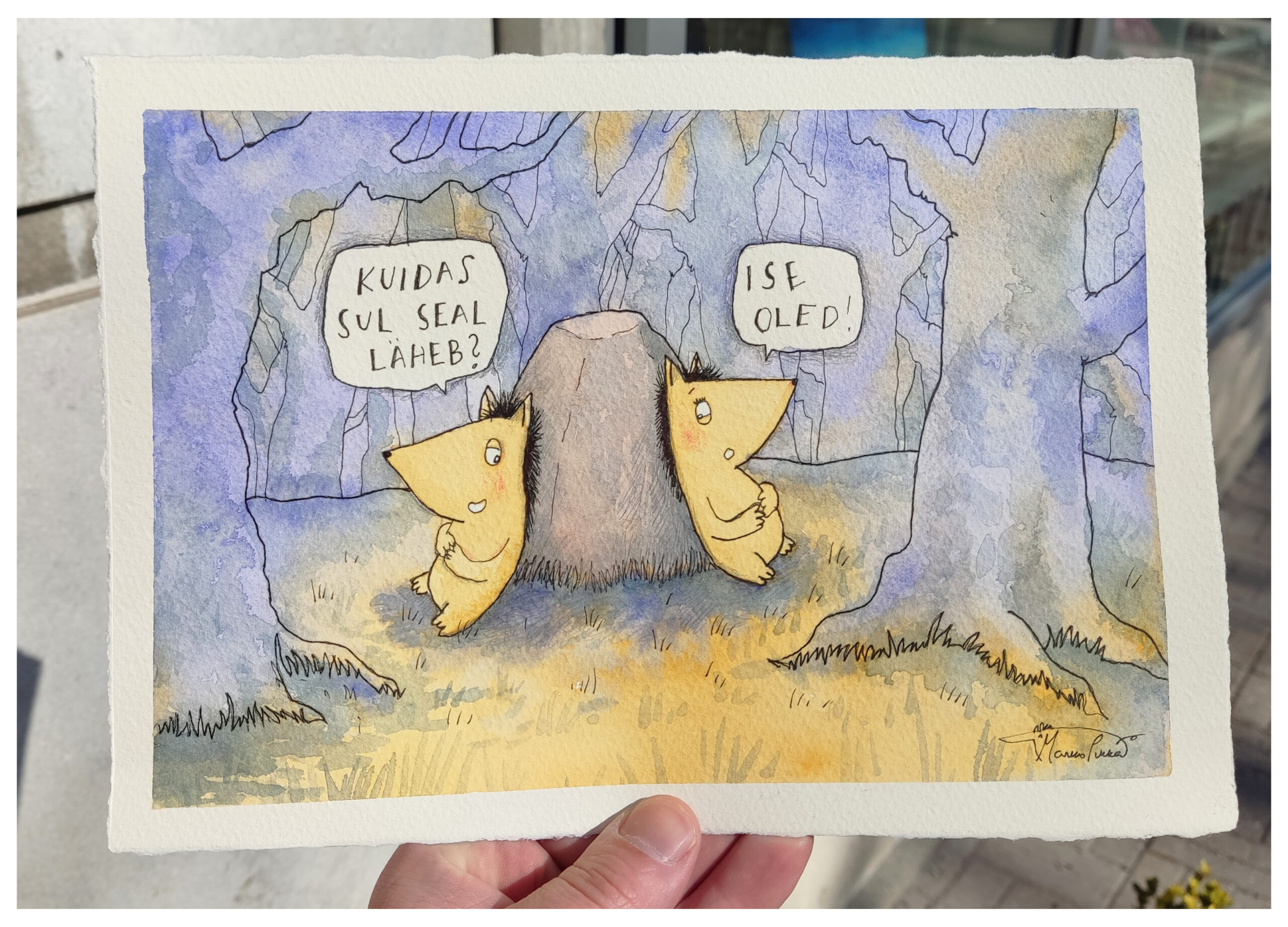 Kuidas sul seal läheb?€69.00 Kirjeldus Nimi: Kuidas sul seal läheb? Suurus: 14,5x23cm Tehnika: Akvarell, tuššipliiats, harilik pliiats Raam: A4 standardraam Raam Valiei soovi raamisoovin maali raamigaPuhasta Kuidas sul seal läheb? kogus Lisa korvi Tootekood: - Kategooria: sõnamängud ja lõbusad originaalmaalid